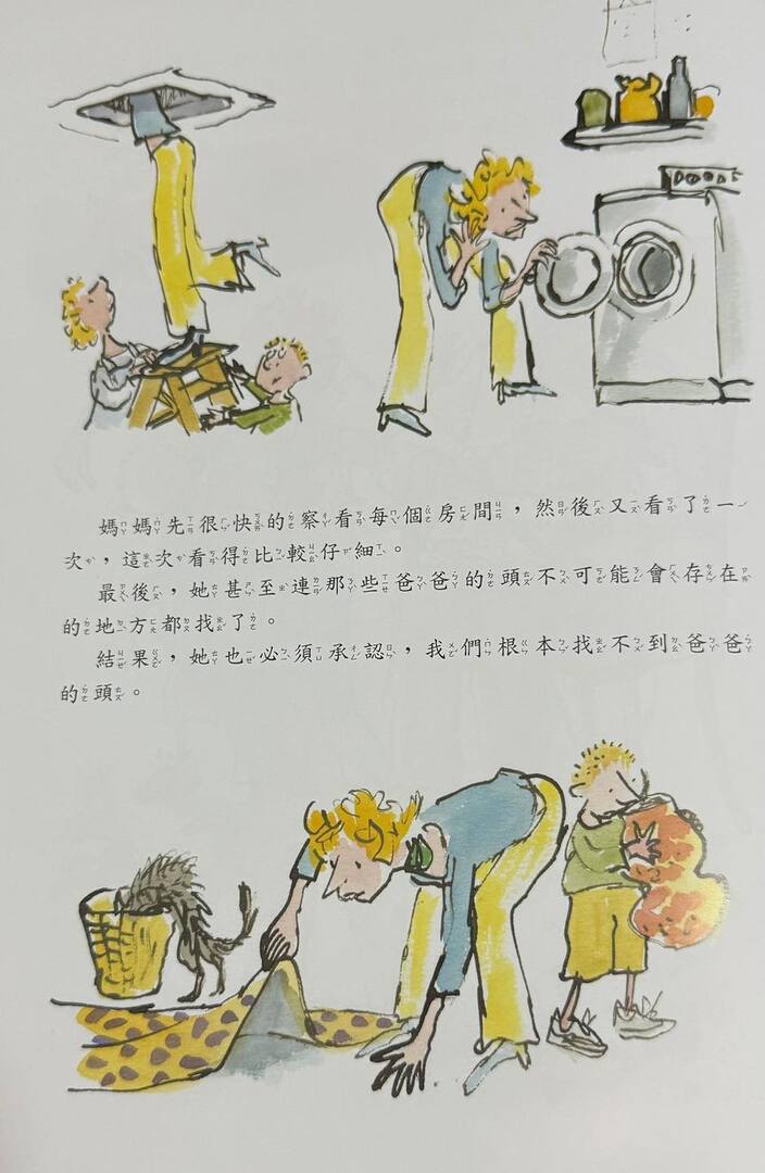 《爸爸的頭不見了》 View Larger Image 《爸爸的頭不見了》爸爸的頭不見了?恐怖暗黑繪本?非也!繪本裡的爸爸只是太專注工作,暗諷爸爸人在心不在。其實爸爸工作真的太辛苦吧!請體諒爸爸又要顧家庭,又要兼顧事業,這並非容易事。不過,我們都鼓勵爸爸們趁孩子年幼時多抽時間親子互動,讓孩子看見你的頭! 否則,當他長大時,你也看不見孩子的頭啊!趁父親節,爸爸們暫時放下手機,放下工作,做一個有頭的爸爸,跟孩子們享受你的特別日子!祝各位爸爸,父親節快樂!《爸爸的頭不見了》文: 安德魯布查圖: 昆丁布雷克譯:劉清彥Share This 2025-06-19T13:02:10+08:00Share This Post With Others!FacebookXLinkedInWhatsAppPinterestEmail Related Posts 你的生命長河中 正處於哪個階段? 22 7 月, 2025 | 0 Comments 《小寶貝,當我遇見你》 19 6 月, 2025 | 0 Comments 《我的完美願望》 19 6 月, 2025 | 0 Comments 《媽媽,妳怎麼了?》 19 6 月, 2025 | 0 Comments